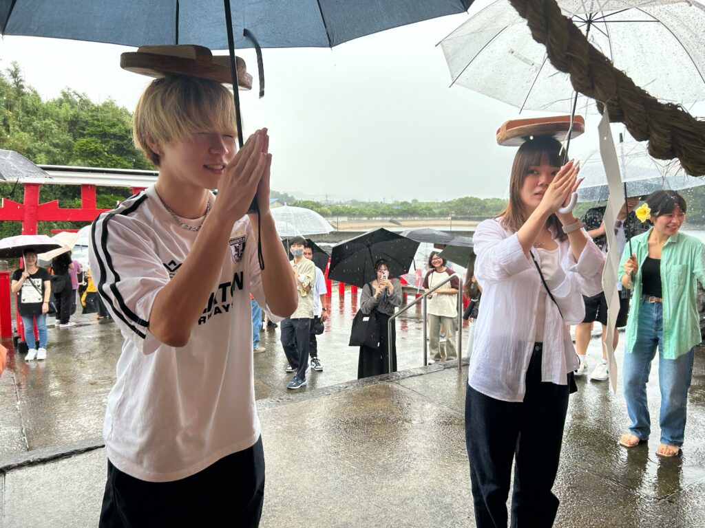 その一つ目の活動として、まず釜蓋神社に行きました。雨の中での参拝となりましたが、頭の上に釜蓋を乗せ、それを落とさずに鳥居から賽銭箱まで歩く、釜蓋神社特有の願掛け参りにも取り組めました。