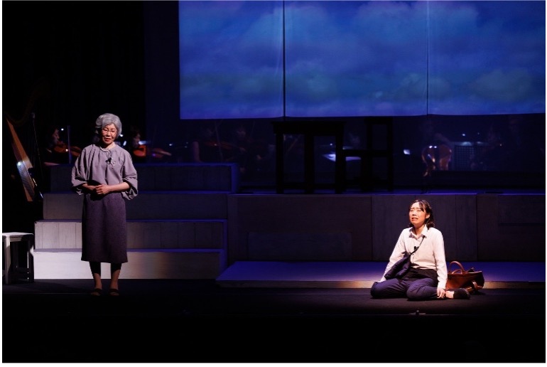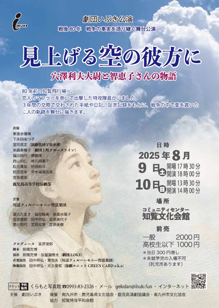 ヒロインをつとめたのは劇団いぶき主催の舞台『見上げる空の彼方に』。80年前に知覧から出撃し戦死された特攻隊員、穴澤利夫さんの婚約者であった智恵子さん役を演じたのが東垂水さんです。劇中では、二人の手紙、日記、さらに知覧特攻平和会館が智恵子さんに対して行った聞き取り調査記録をもとに、二人が懸命に生きた3年間が描かれました。