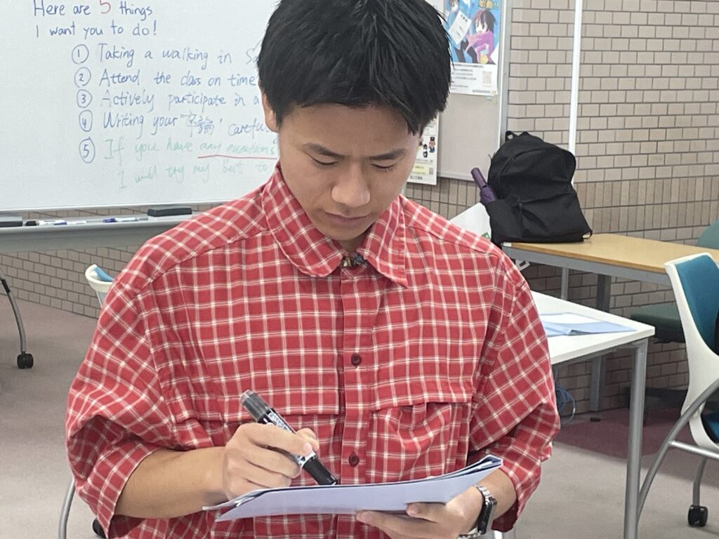 その後は4年生がマクマレイ先生とTA(指導助手)の大学院生と卒論について短い面談をしました。4月から取り組んでいる卒論のテーマを変更した生徒はおらず、全員発表会に向けて少しずつ準備を進めている様子が見られました。生徒同士で書き方の相談をする、簡単なアンケートを取る様子が見られ全員で協力する雰囲気が作られていました。