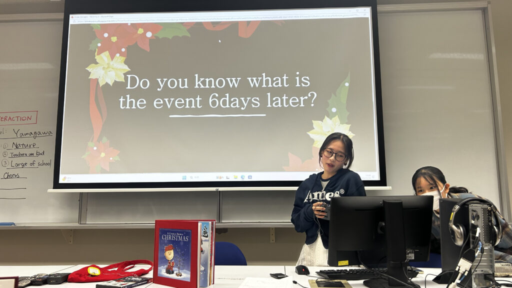 12月19日の「英語科教育法IV」で模擬授業の先生役の学生は、英語で「Merry Christmas!」と言って授業を始めました。