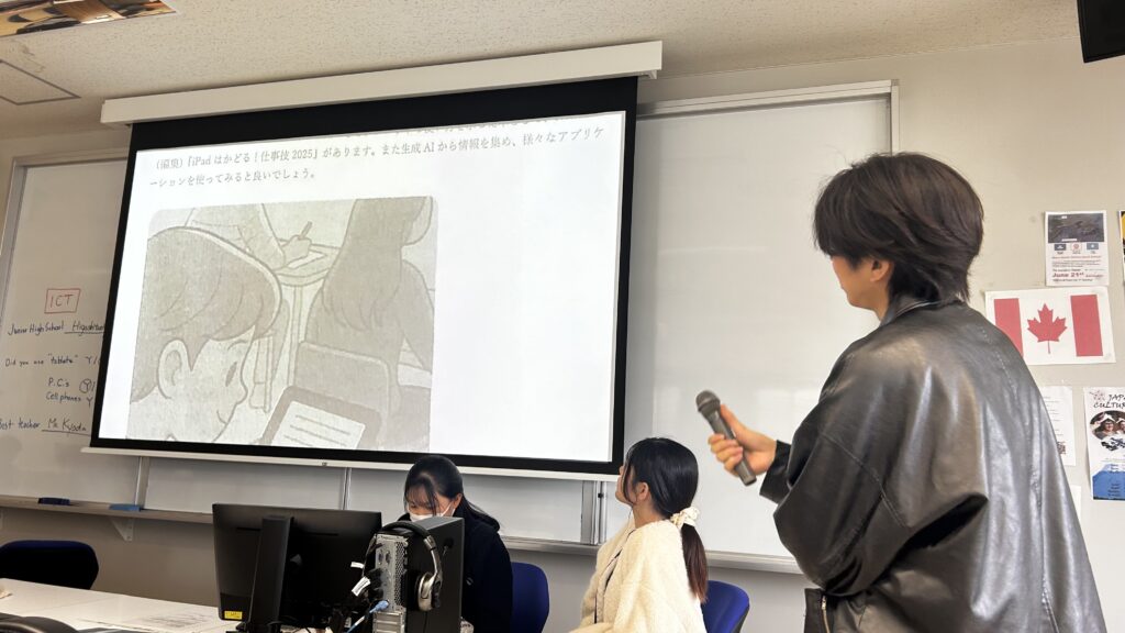 12月26日、今年最後の講義となったマクマレイ教授担当の「英語科教育法Ⅳ」ではICTを題材にした模擬授業を行いました。これまでに見学させて頂いた授業では、私たちが受講した授業と比較するとタブレットなどのICTをより活用した授業を行っていたため、私たちが受けた授業と比べて、ICTの導入が進んでいると感じました。特に、タブレットやデジタル教材を使った授業は、視覚的にわかりやすく、学生一人ひとりのペースに合わせて学習を進められる点が魅力的だと感じました。