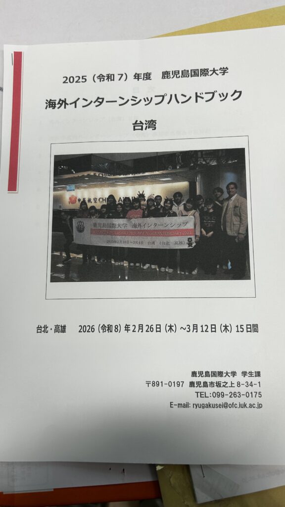 また、王さんからは海外インターンシップ用のハンドブックが配布されました。ハンドブックには、インターンシップの流れや注意事項だけでなく、台湾滞在中の緊急連絡先なども分かりやすくまとめられており、実際の生活をイメージしやすい内容でした。