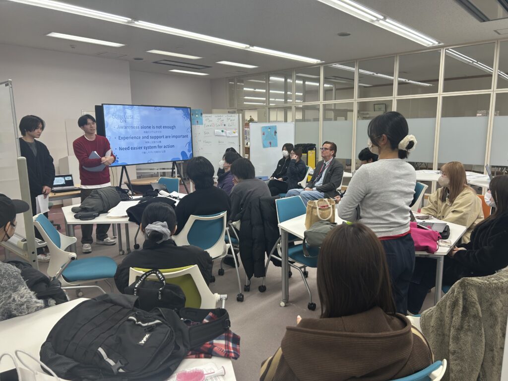 ゼミ生22名全員が着席し、発表が始まりました。4年生の尾上裕真さんは、「ヨット競技者の視点から見る海洋汚染問題」について語りました。4年生の梅橋佑日さんは、「教材は学習者にどう語りかけるべきか――中学生の学習意欲を最大化する『場面別』指示表現の検討」について話しました。