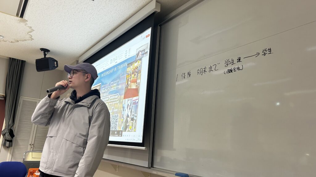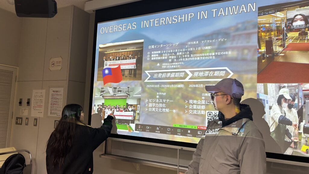 本日の授業を通して、答礼会の重要さを感じ、台湾のインターンシップに行った際には必ず成功させようと思いました。来週で海外インターンシップの授業が最後なのでインターンシップ生で一丸となって頑張りたいと思います。